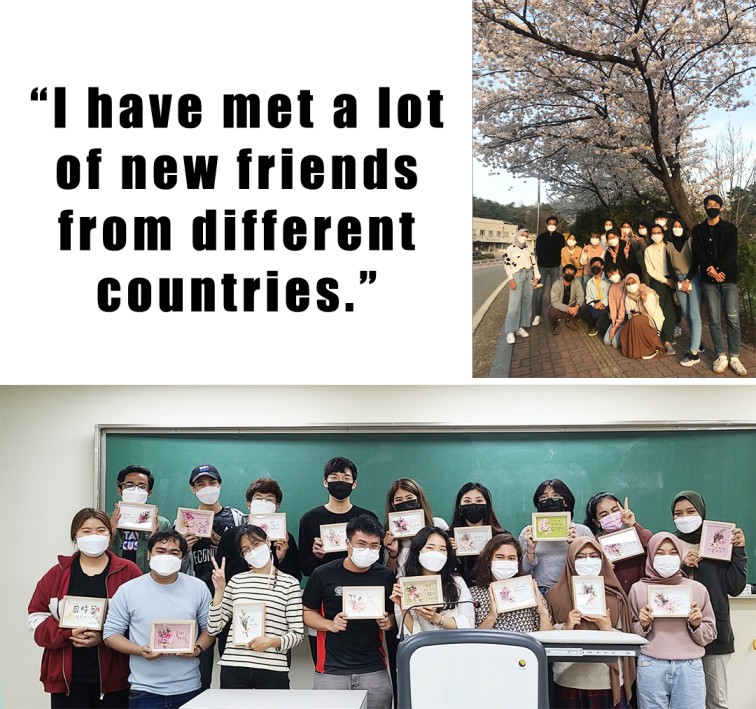 I have met a lot of new friends from different countries. There are many activities outside class for students to do, for example, the club activities. I have learnt about the Korean culture from my native friends.