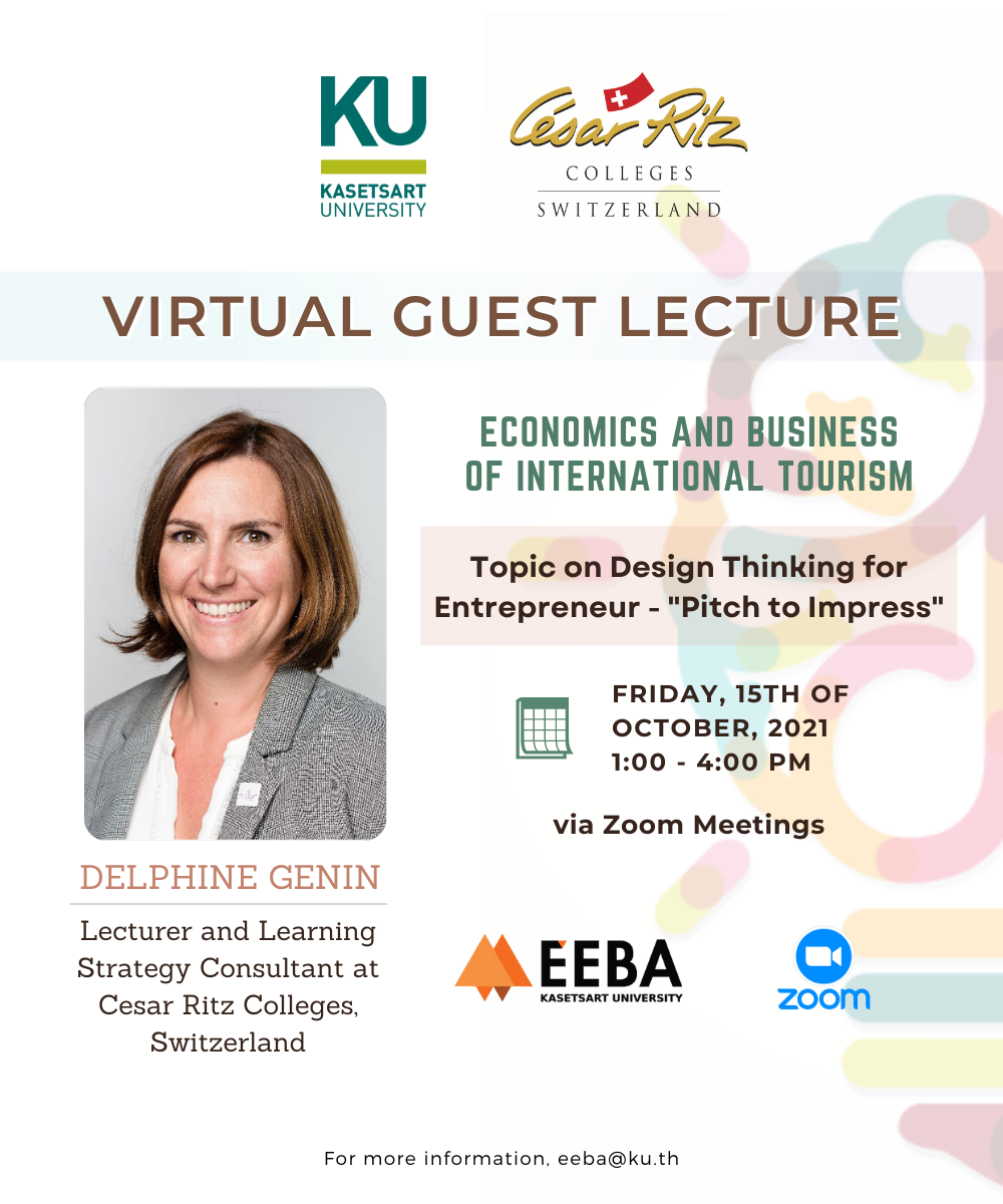 For the subject course, Economics and Business of International Tourism, a virtual lecture topic on Design Thinking for Entrepreneur: Pitch to Impress was given by Ms. Delphine Genin, Lecturer and Learning Strategy Consultant at Cesar Ritz Colleges Montreux, Switzerland. This academic collaboration is on October 15, 2021.