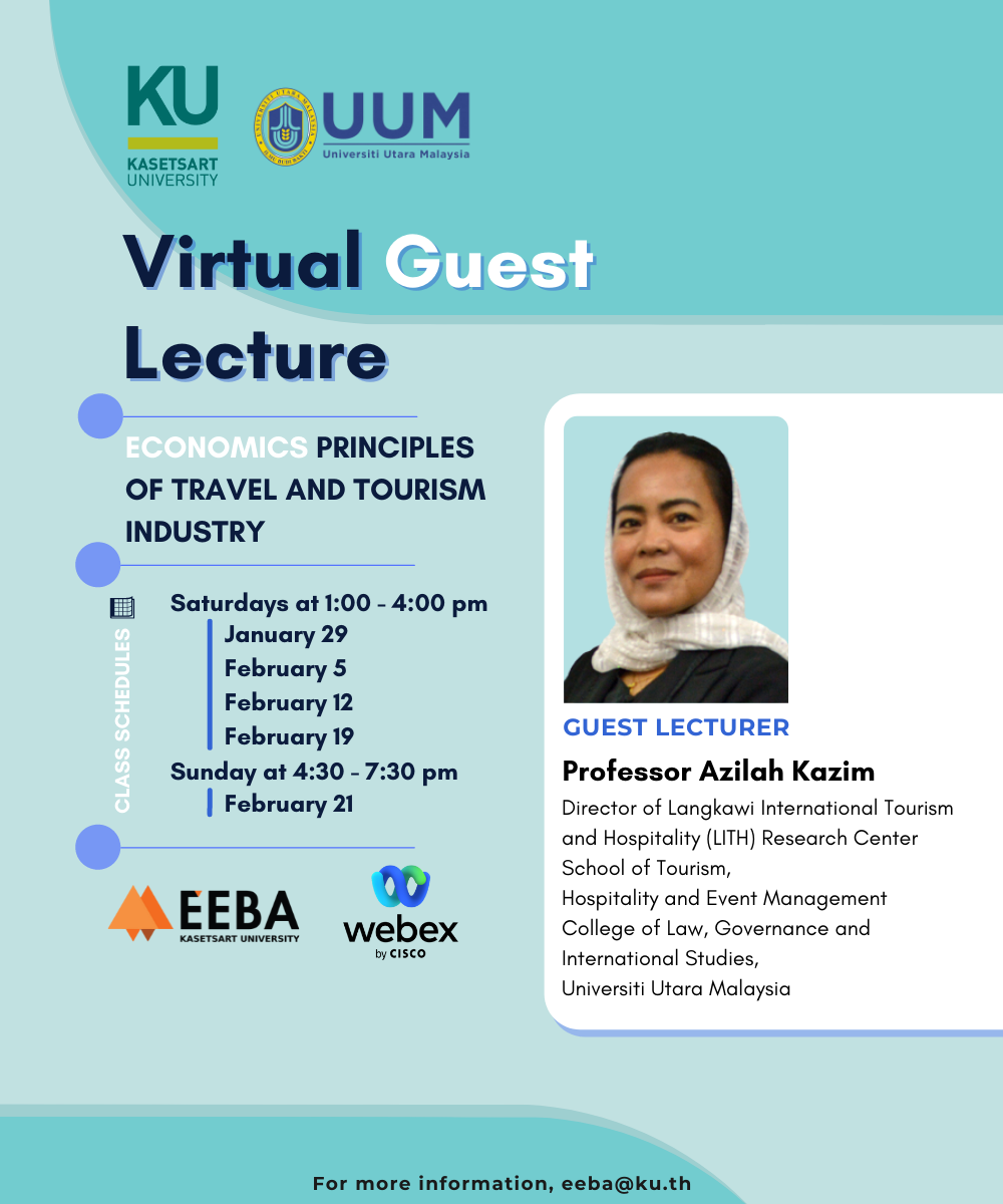 For the subject course, Economics of Travel and Tourism Industry, several lecture topics will be given by Dr. Azilah Kazim, Director of Langkawi International Tourism and Hospitality (LITH) Research Center, School of Tourism, Hospitality and Event Management College of Law, Governance and International Studies at Universiti Utara Malaysia. The lecture dates for this academic collaboration, started on January 29 until February 21, 2022.