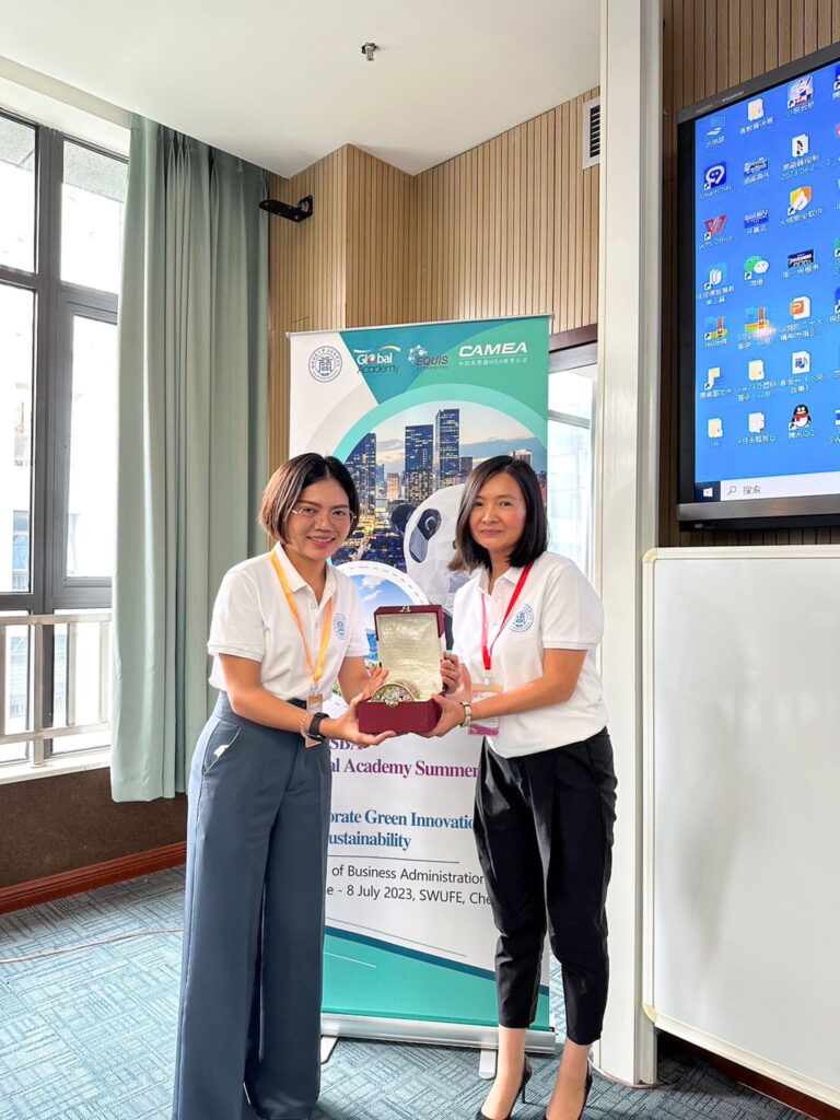 On this occasion, Ms. Chinnatthee Kaewkongnok, the representative from ECIA, presents a token of appreciation to Professor Mingfeng Tang, the Associate Dean for International Affairs of the School of Business Administration at the opening ceremony.
