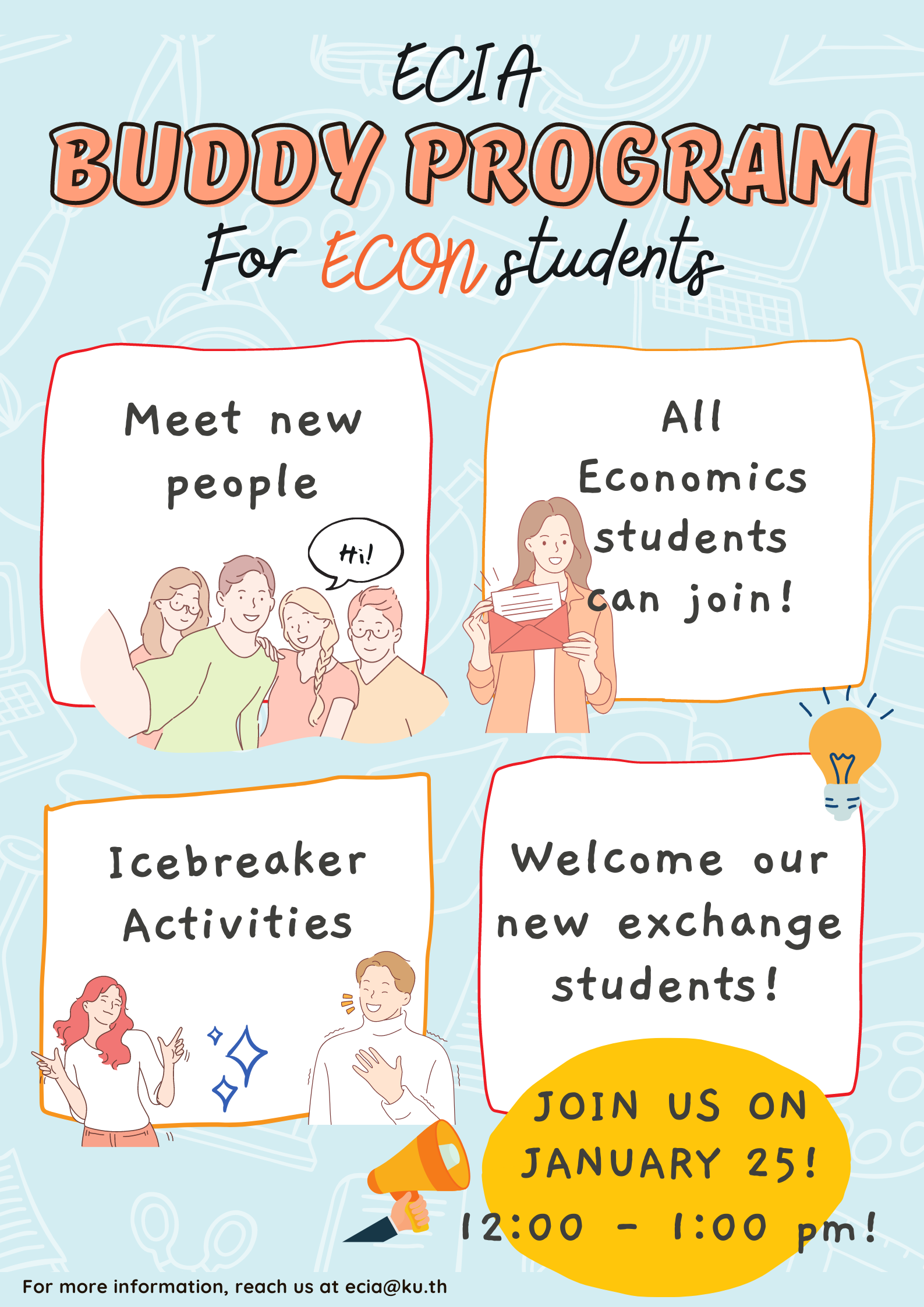 On January 25, 2022, ECIA held an ECON Buddy Program Meet & Greet + Orientation to the Faculty of Economics to welcome all our new exchange students in the faculty. Useful information about KU and the Faculty of Economics and some tips in knowing their way inside campus were discussed. This gave the attendees a chance to be able to meet their ECON buddies through an icebreaker activity as well.